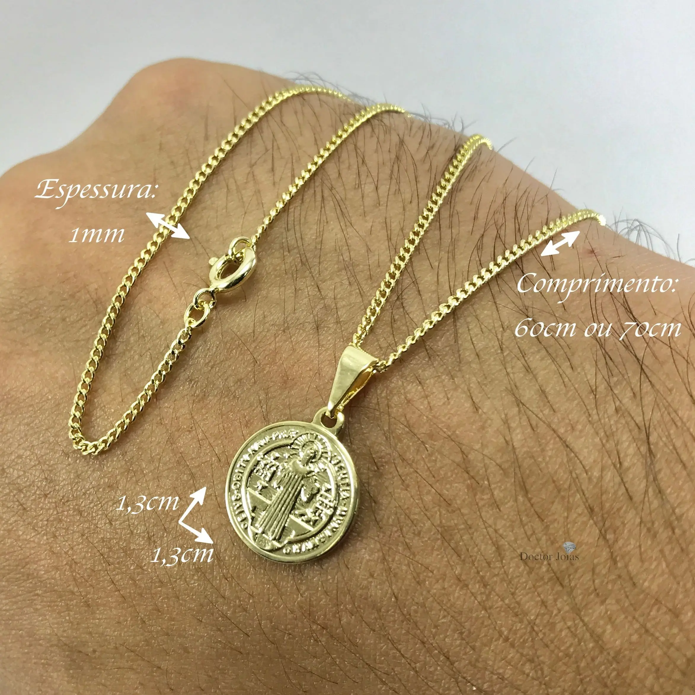 Conjunto lindo e discreto, parece ouro puro, tanto a cor do banho quanto o acabamento, linda corrente Grumet 1mm e pingente medalha de São Bento pequena frente e verso.